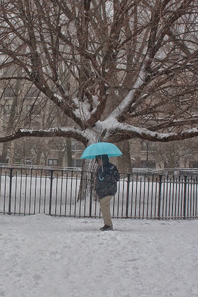 This East Villager wore khaki pants and carried a cyan umbrella through Tompkins Square Park during the blizzard: